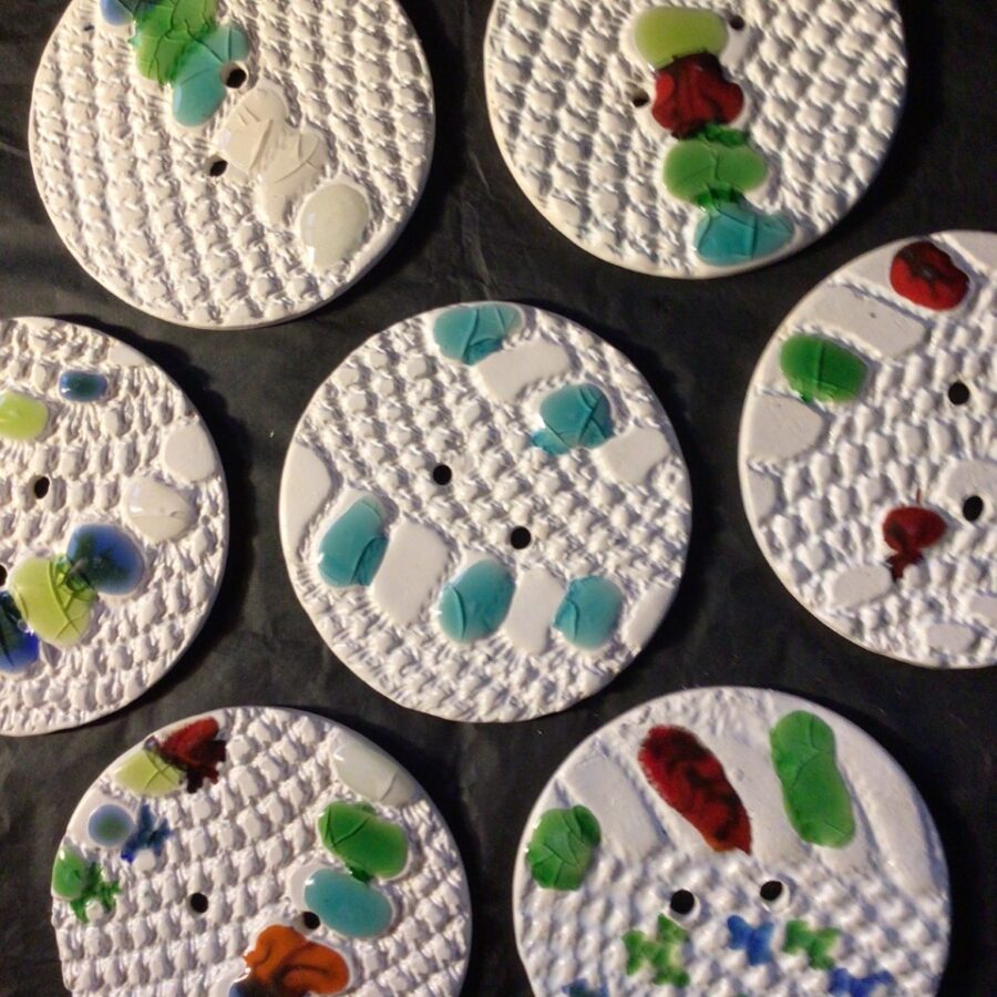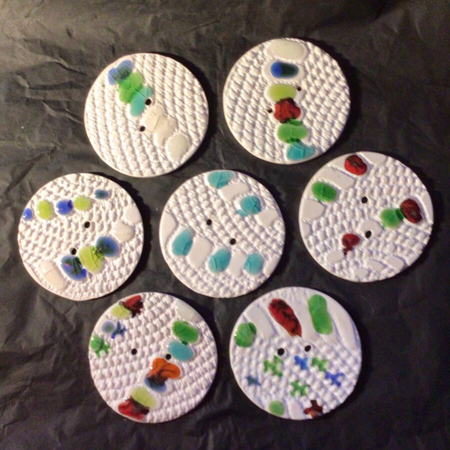 Beautiful textured white ceramic buttons glazed with a white glaze with fused glass coloured spots. If you have a colour preference to the glass spots please state in the comment box on ordering.