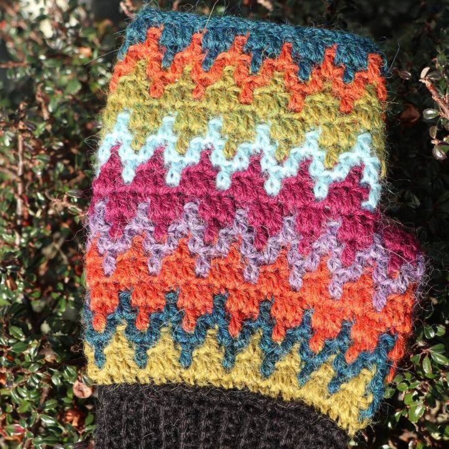 Get ready for the more wintry weather with these stylish fingerless gloves. They are made using the crochet technique ‘mosaic crochet’. They are 100% alpaca wool mittens. Each pair is unique - Ingrid never makes two the same. They will fit any average adult size.