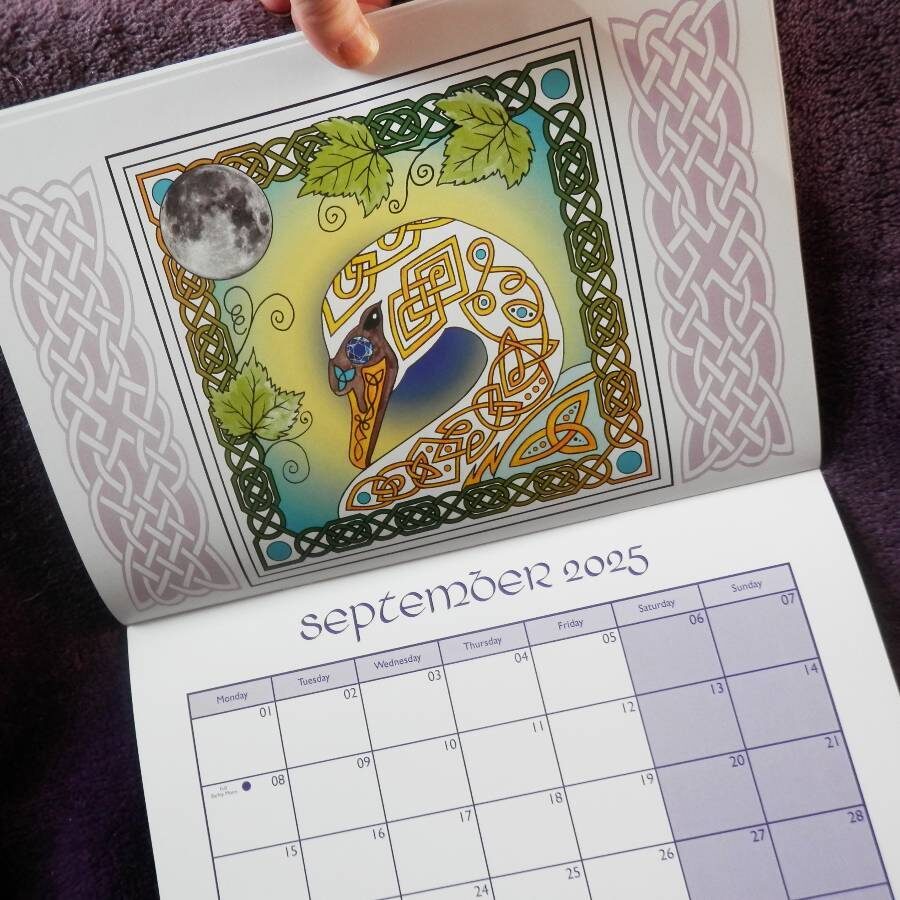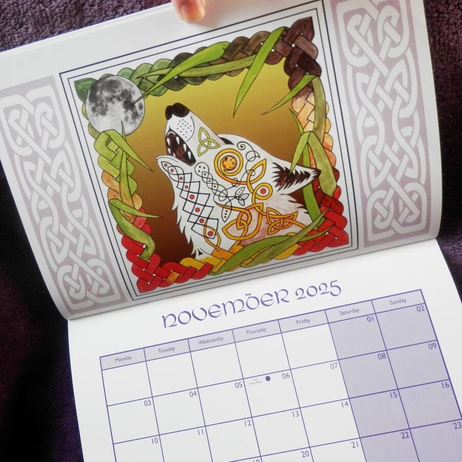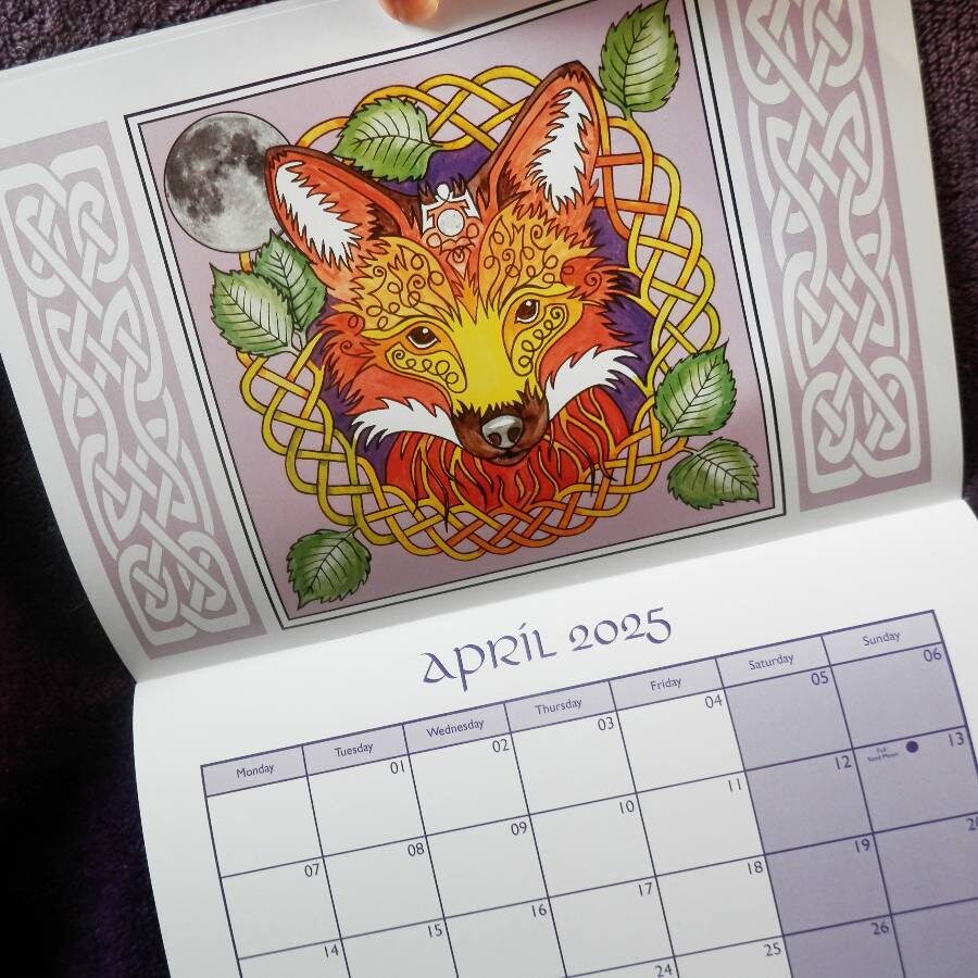 A stunning 2025 wall hanging calendar which is A4 in size, stapled in the middle, folding out to A3 when hanging. It features 12 fabulous hand drawn animal designs which have been hand painted and then digitised to finish. Each image page is in a Celtic style with knotworks and features the relative Celtic Tree Zodiac, an image of that month’s full moon and also has birthstone references incorporated in the animal image. There are big spaces on date pages for your notes, plus indication of that month’s full moon date and one of the ancient moon names.