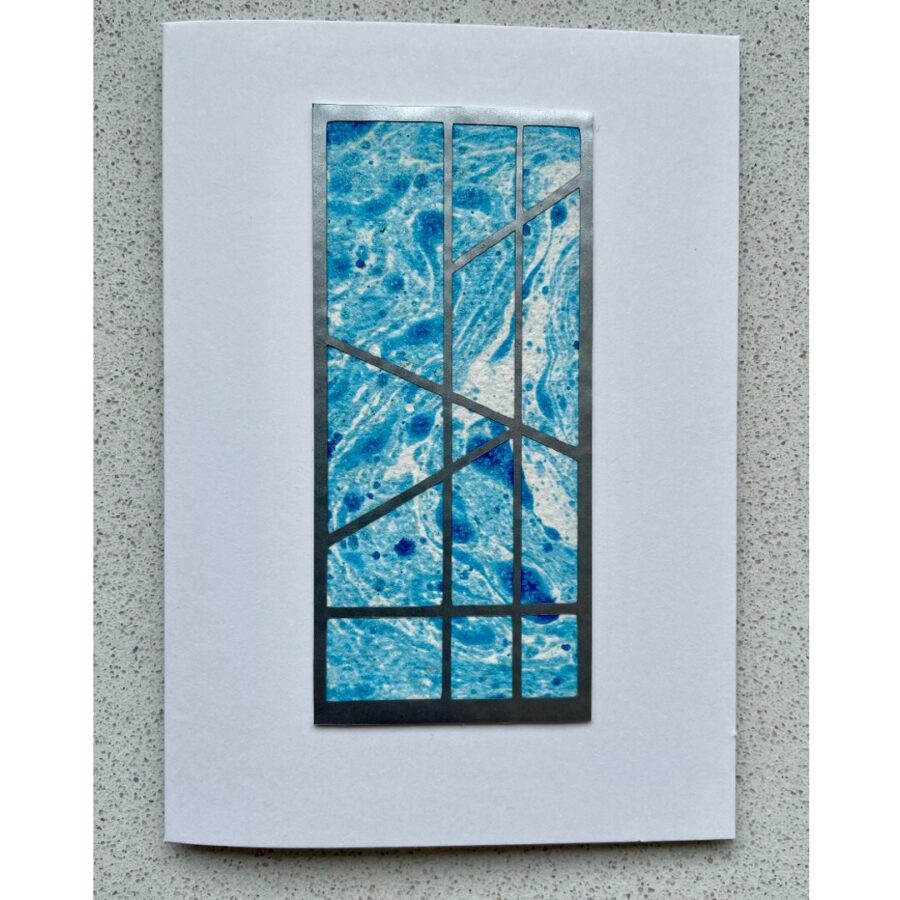 A handmade collage card using satin finish and hand crafted marbled paper.