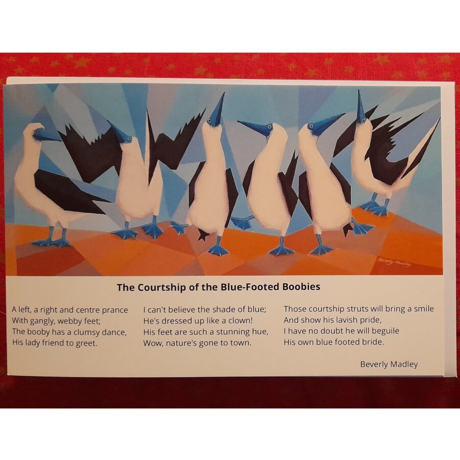 A greetings card featuring a blue footed bobbies based on an original painting and poem by Beverly. Printed on 300 gsm card with white envelope and blank for your own message.