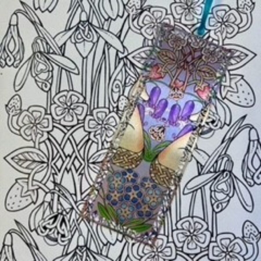 A charming Celtic Harebells aluminium bookmark printed on both sides, has an ornate border around the edge and is finished off with a satin ribbon. Each bookmark is sold in card packing and cellophane wrapper making it an ideal gift.