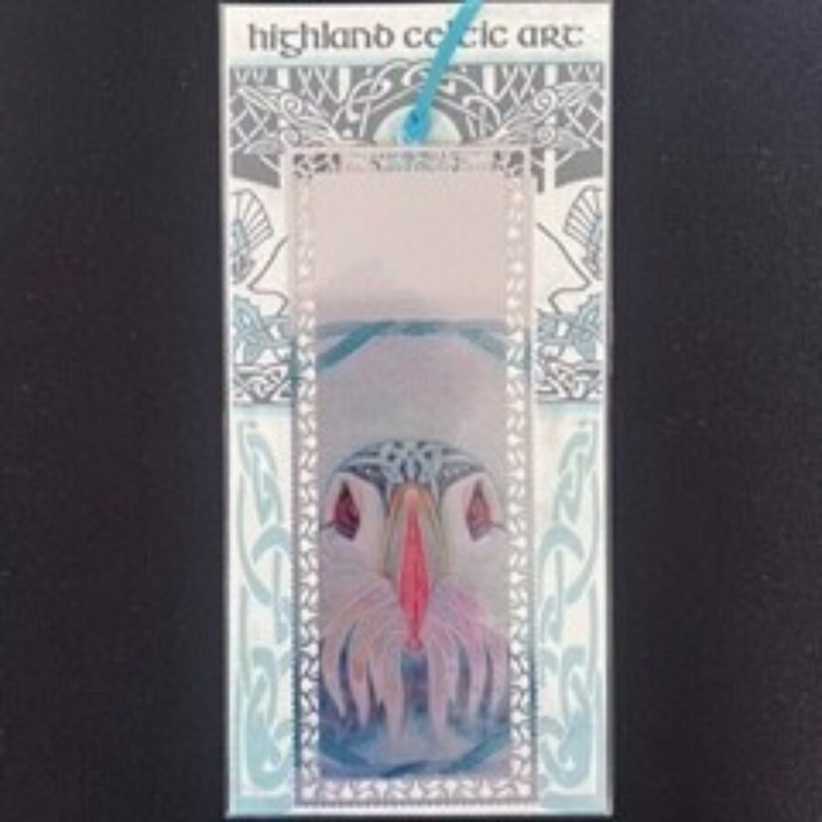 A charming Celtic Puffin aluminium bookmark printed on both sides, has an ornate border around the edge and is finished off with a satin ribbon. Each bookmark is sold in card packing and cellophane wrapper making it an ideal gift.