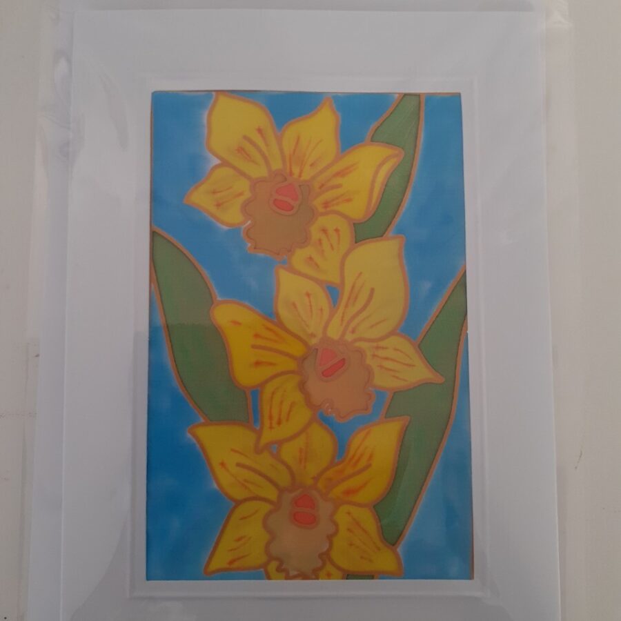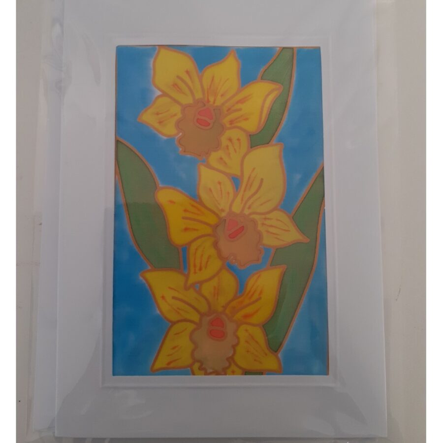 Individually hand painted silk card of daffodils, in a high quality embossed mount, with high quality envelope. Packed in cellophane. Each piece of silk is individually hand painted, finished, mounted and packed by the artist in her studio.