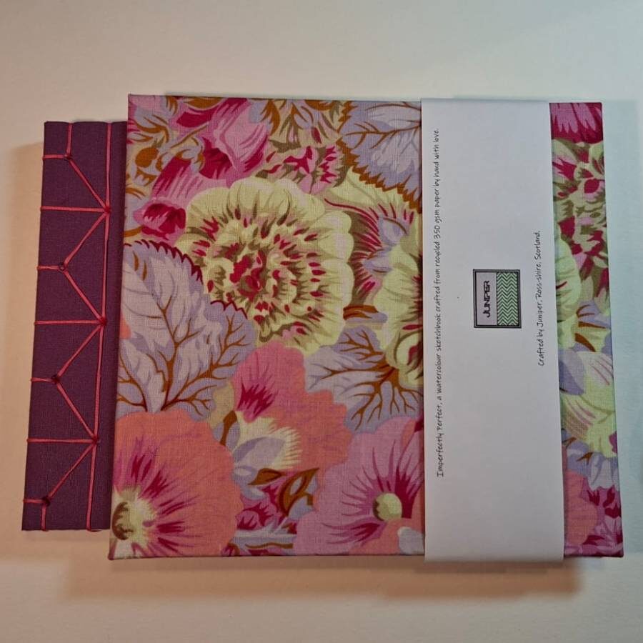 A Japanese style part hard cover sketchbook covered in two different floral designs of bookcloth and containing 22/42 pages of Shore & Marsh 350 gsm watercolour texture/plain paper. Stab bound with waxed thread for strength.