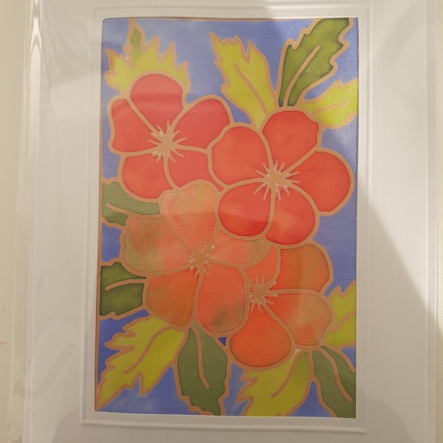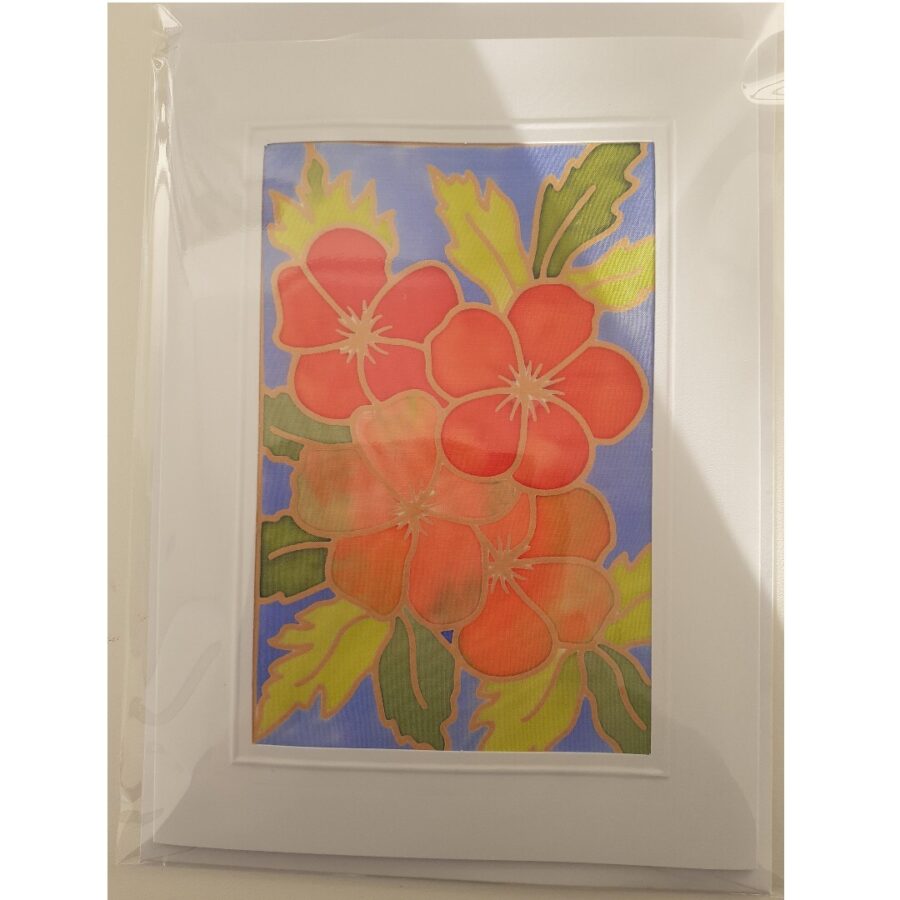 Individually hand painted silk card of garden flowers, in a high quality embossed mount, with high quality envelope. Packed in cellophane. Each piece of silk is individually hand painted, finished, mounted and packed by the artist in her studio.