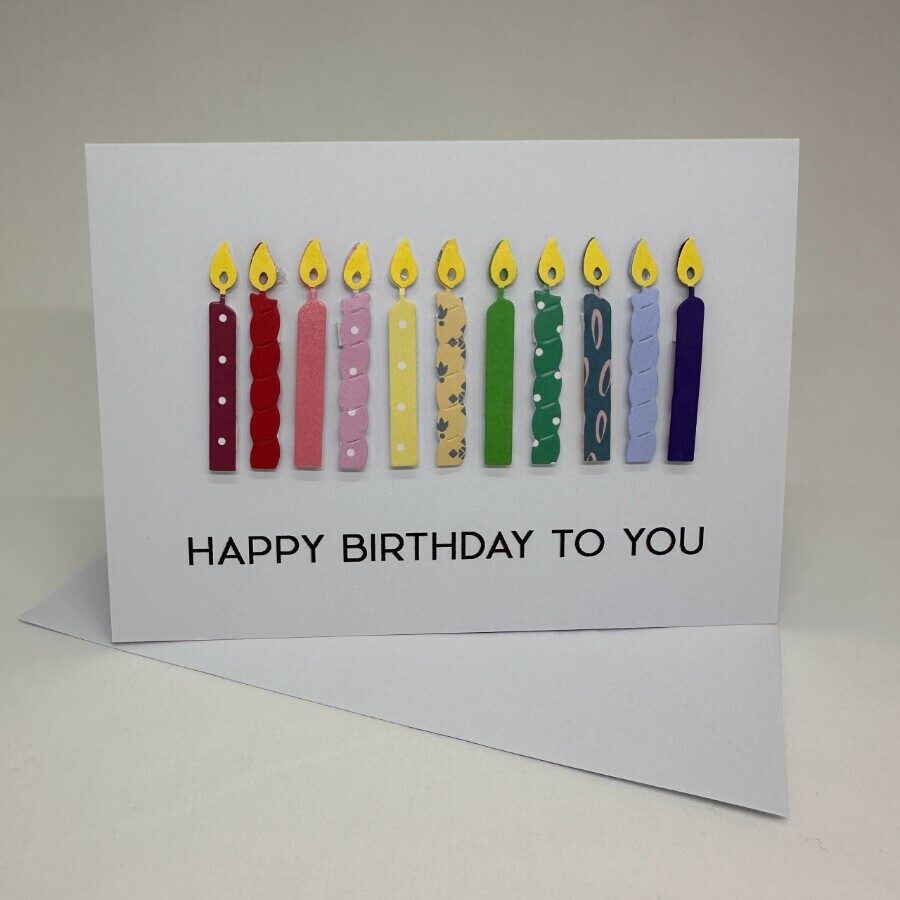 A medium handmade birthday card with a rainbow of 11 coloured candle embellishments and the words “Happy birthday to you”. Made on white card with matching envelope. Blank inside for your own message.