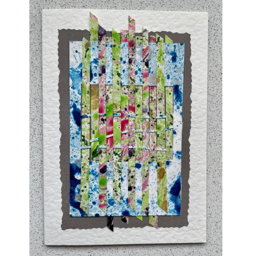 A handmade collage card using paper weave from hand crafted marbled paper.