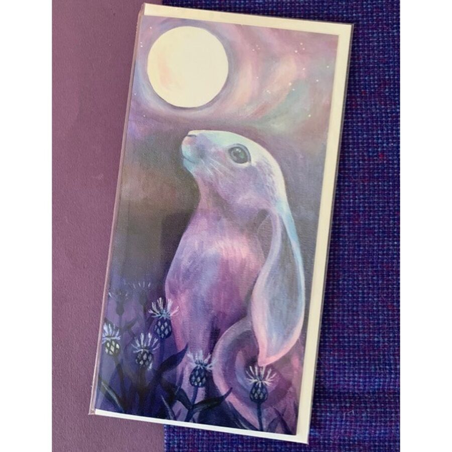 This lovely card features May's Moon design. Printed on 350 gsm heavyweight silk board. Supplied with a high quality craft envelope and individually cellophane wrapped. The inside is left blank so you can write your own personal message.
