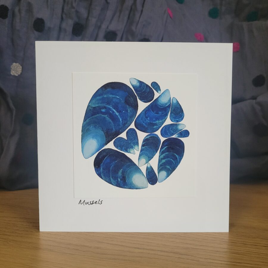 A beautiful handmade card with a print of an original artwork "Mussels" by Hannah MacIver. The card is left blank inside for your own message.