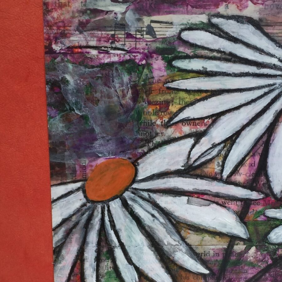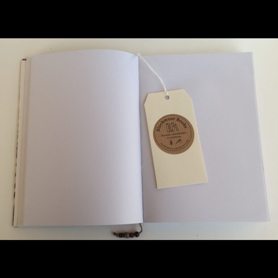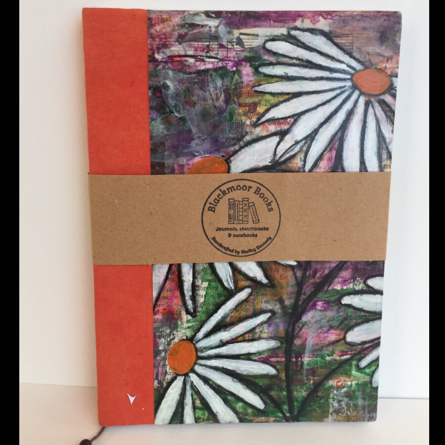 This beautiful A5 journal by Blackmoor books has a semi-hard cover (flexible) and is filled with pages of 90gsm recycled paper for journalling, note taking or even your favourite recipes. It is bound by hand and has 72 pages. The cover is original artwork by Shelley Kennedy and is a collaged background with painted orange flowers. It has a silver ribbon bookmark so you can easily find where you were.