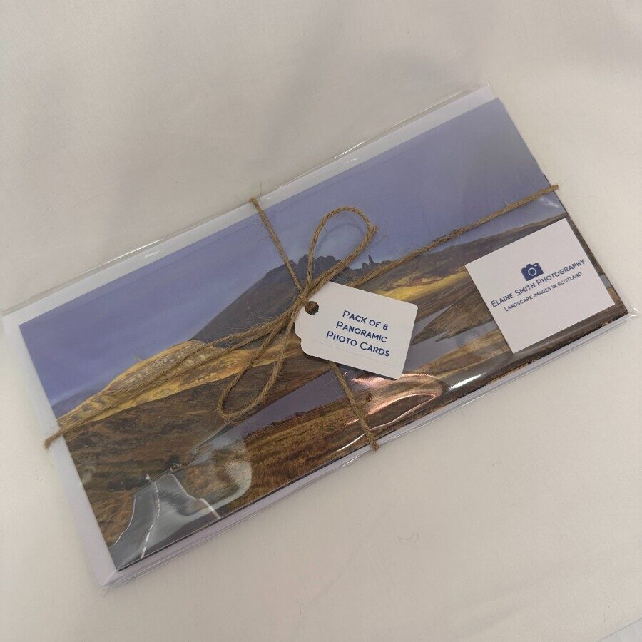 Pack of 6 note or greetings cards of landscape images in Scotland (this pack includes Barra Boat, Knoydart sunrise, Glen Affric, Tarskavaig, Lenticular Clouds and the Old Man of Storr). The cards measure 8" x 4" and are printed on 300gms TruCard; cards are supplied with white envelopes.