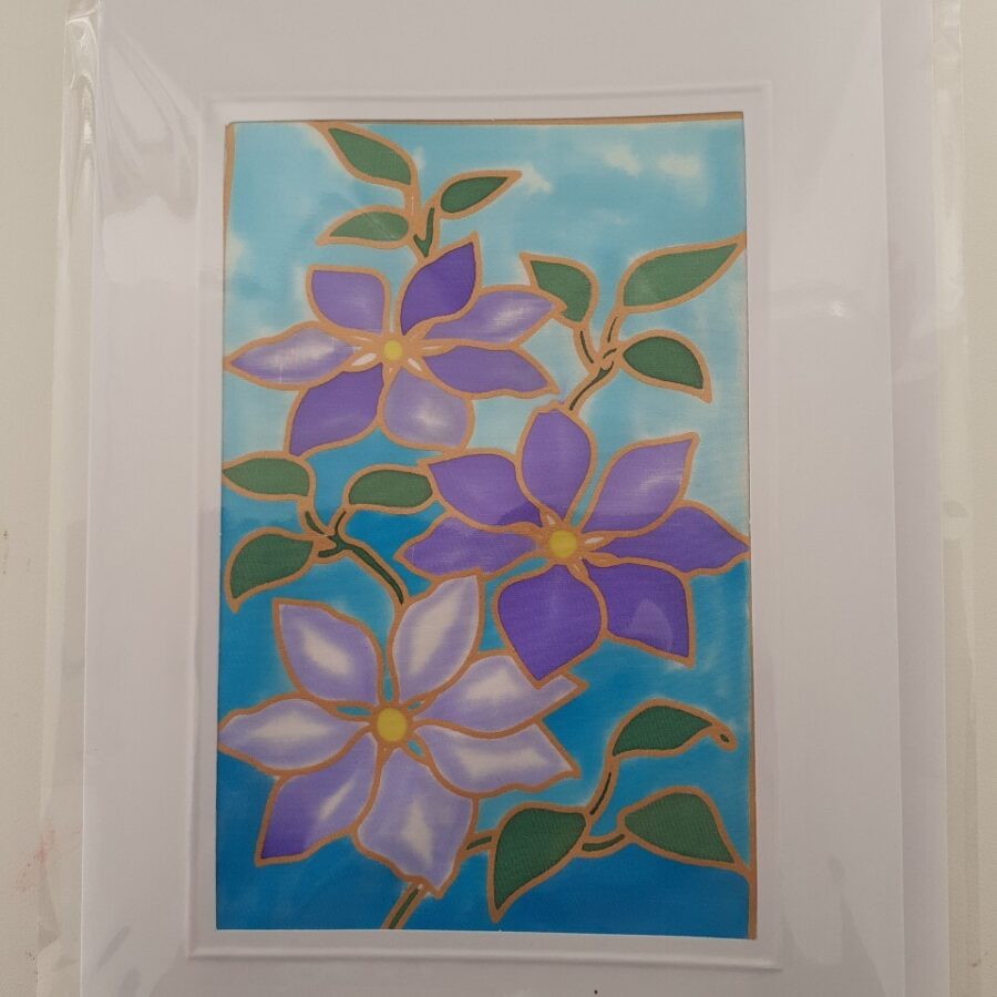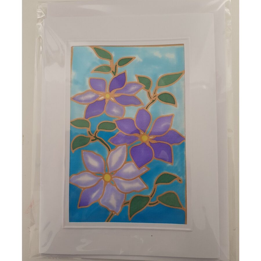 Individually hand painted silk card of periwinkle, in a high quality embossed mount, with high quality envelope. Packed in cellophane. Each piece of silk is individually hand painted, finished, mounted and packed by the artist in her studio.