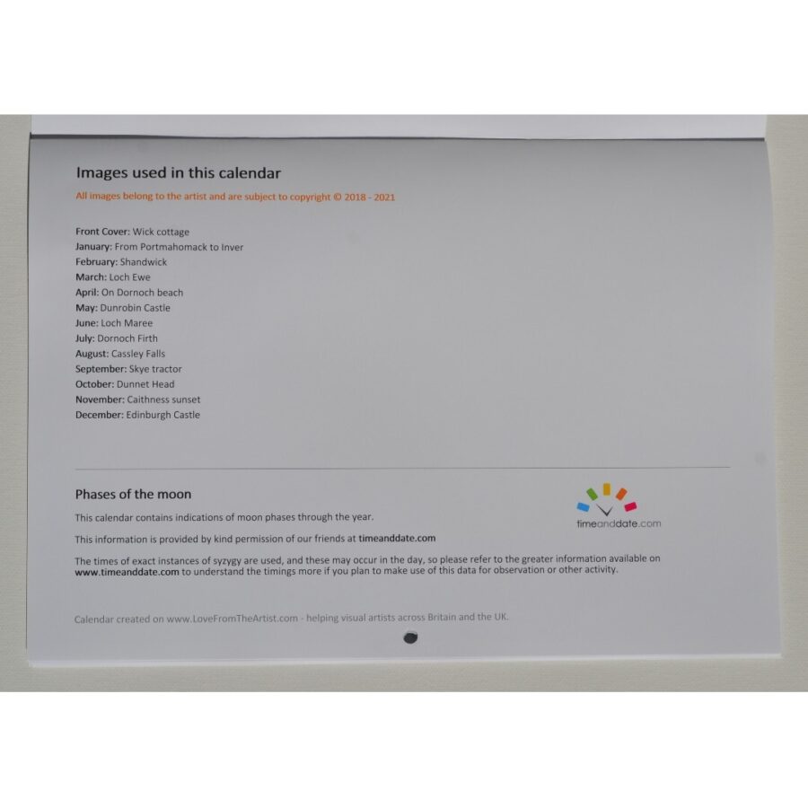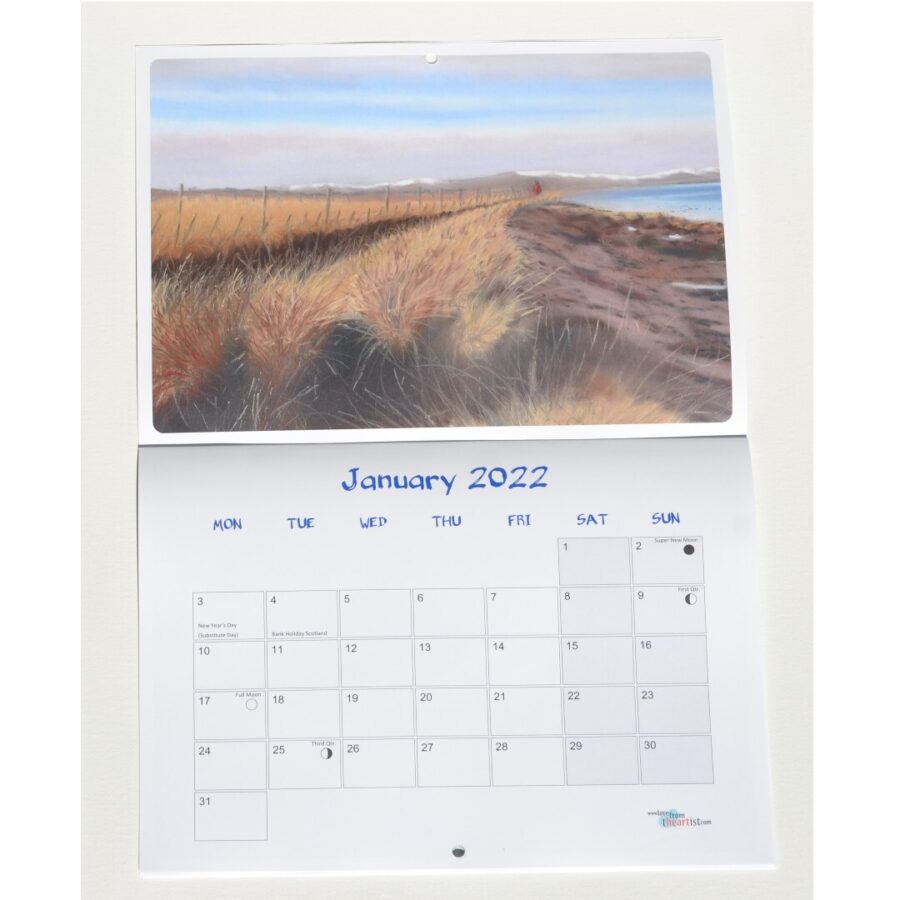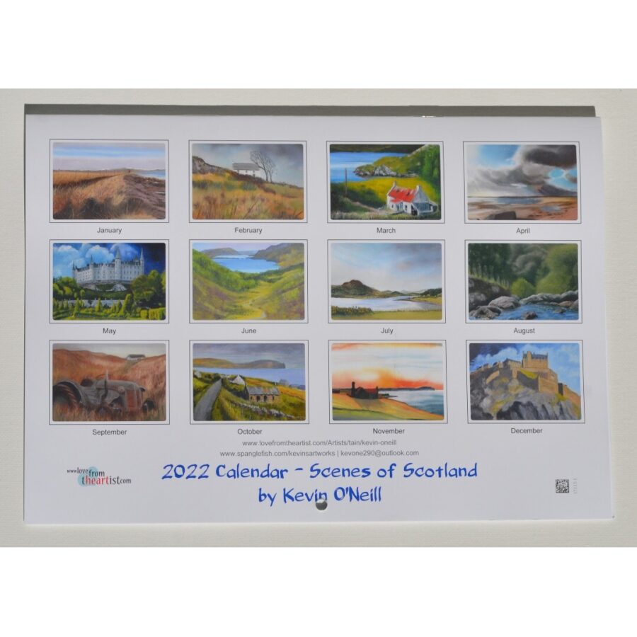 This 2022 calendar features original paintings by Kevin O'Neill of scenes of Scotland. There is an A4 page per month showing UK public holidays and phases of the moon, plus an A4 image. Each month has a different image plus an extra image on the front cover. They are stapled with a hole for hanging and come in a protective cover. You may even want to frame some of the images.