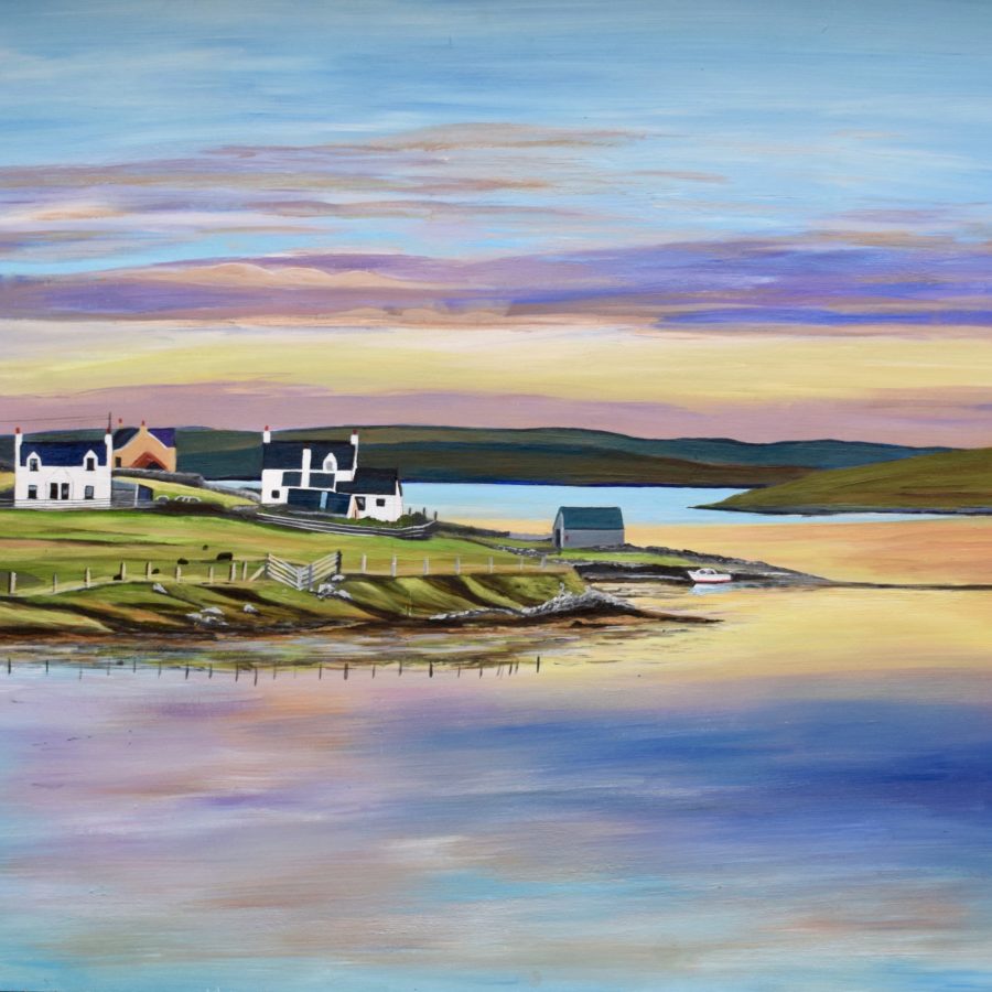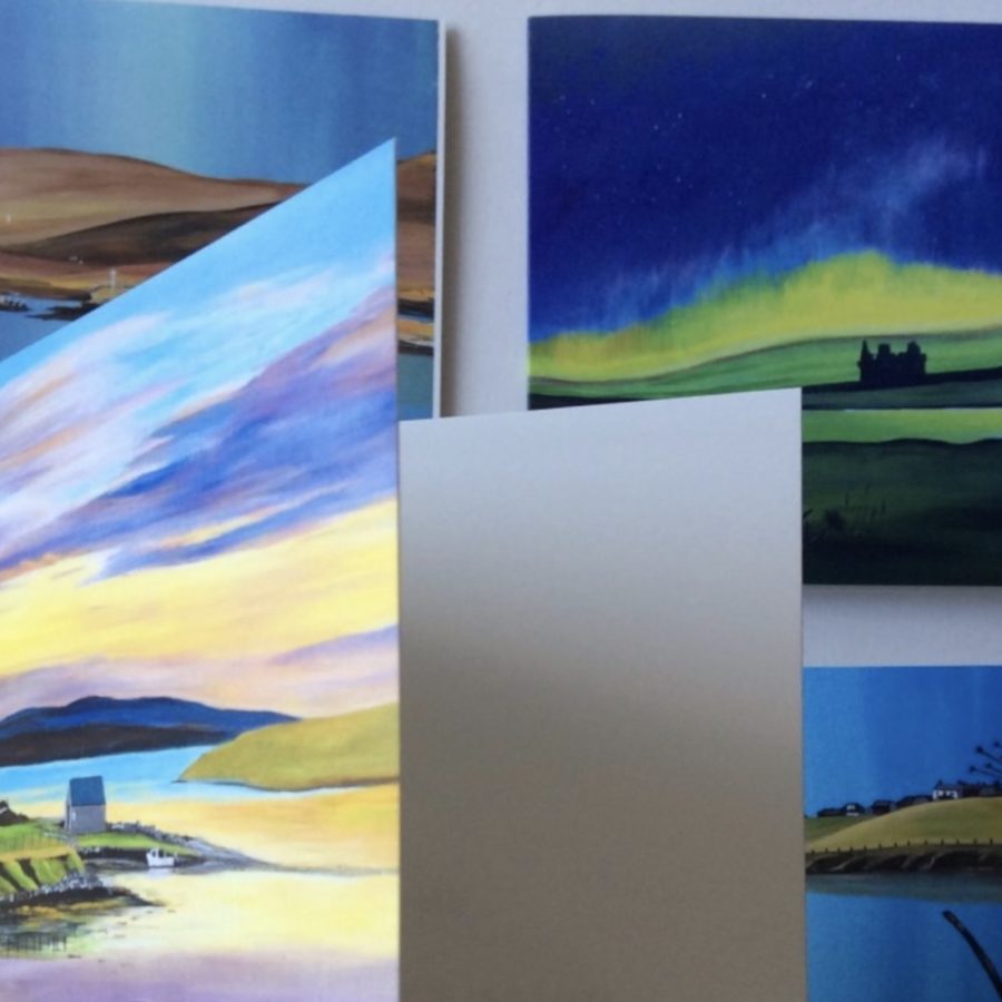 Pack of 5 cards featuring paintings of Shetland scenes by Sarah Kay. They come with a white envelope and are individually wrapped in a cellophane bag. The cards are left blank inside for your own message.