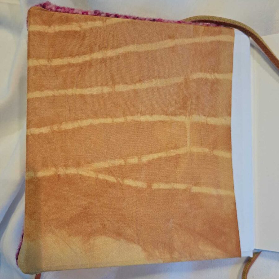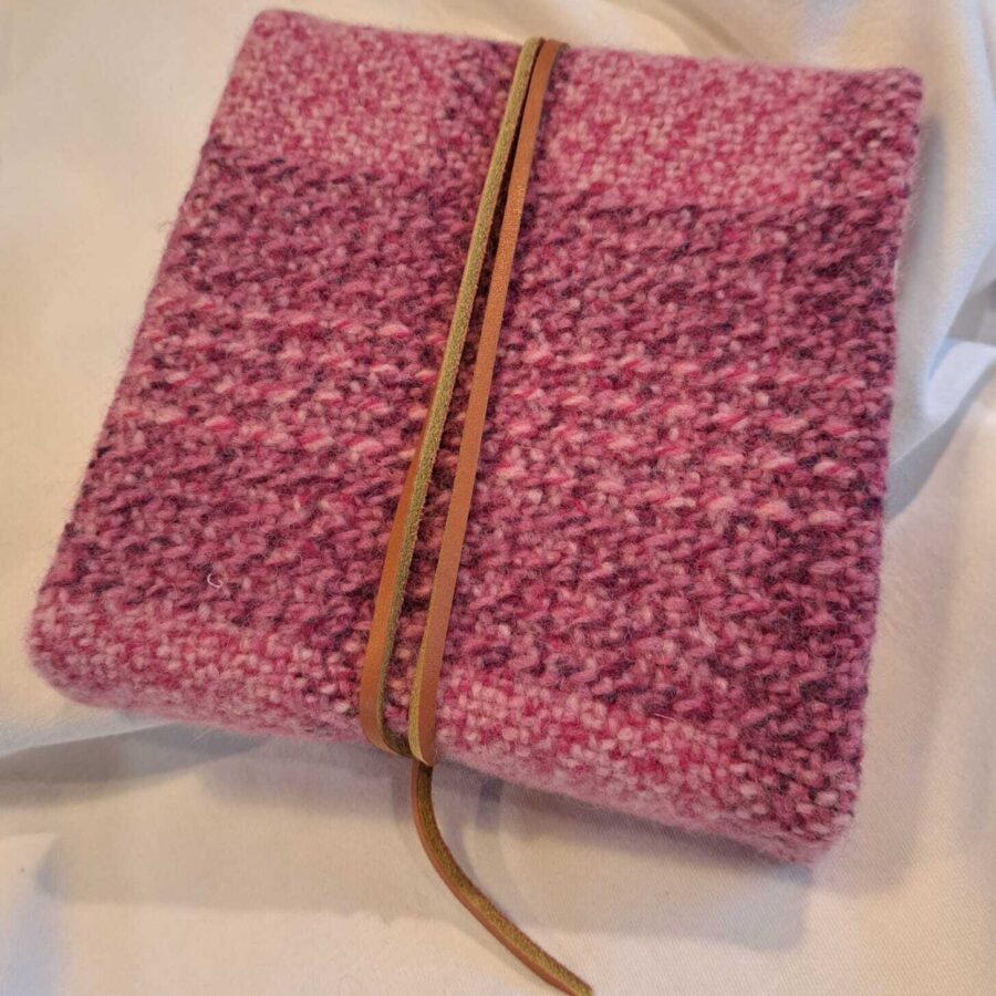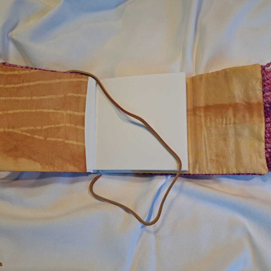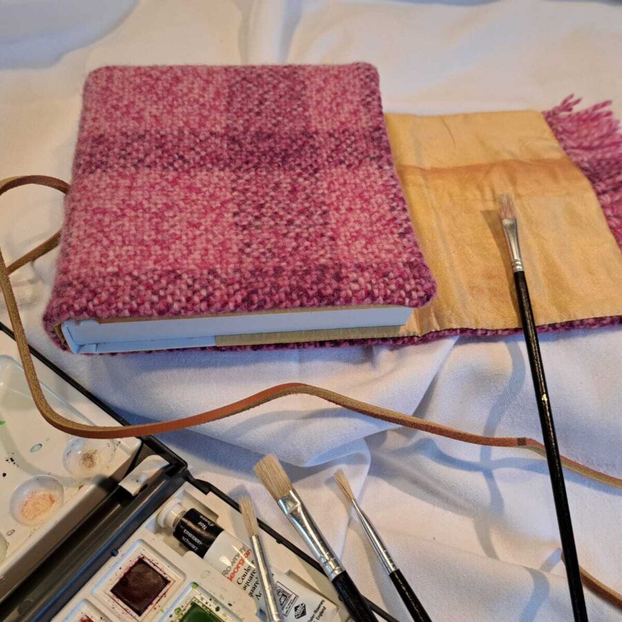 This beautiful sketch book has a slip cover constructed from handwoven wool fabric made on a rigid heddle loom. The lining fabric is a botanical dyed 100% silk fabric. The sketch book is closed by a self tie leather thong. It has 140 gsm all media acid free cartridge paper inside which is sized for extra wet strength. It is an ideal gift for an artist. Price includes UK delivery via Royal Mail 1st Class post.