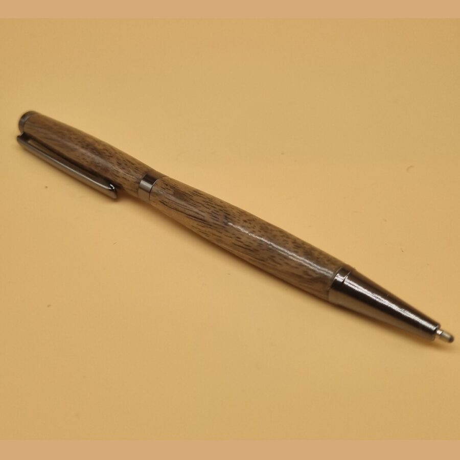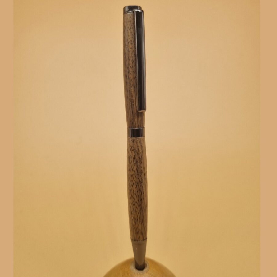 A beautiful hand-turned black walnut wood slimline twist pen made from locally sourced windblown and recycled wood. Finished in resin and polished for a hard wearing super high gloss finish with a gun metal pen kit.