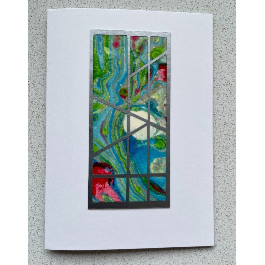 A handmade collage card using satin finish and hand crafted marbled paper.