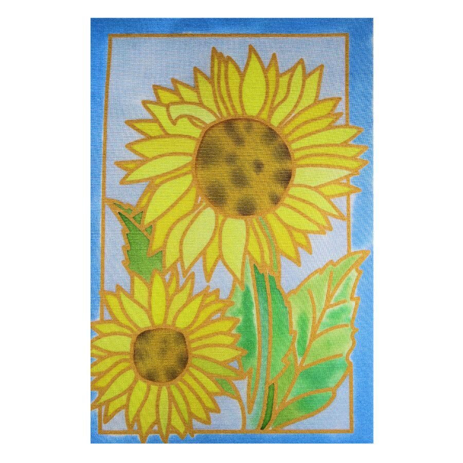 Individually hand painted silk card of sunflowers, in a high quality embossed mount, with high quality envelope. Packed in cellophane. Each piece of silk is individually hand painted, finished, mounted and packed by the artist in her studio.