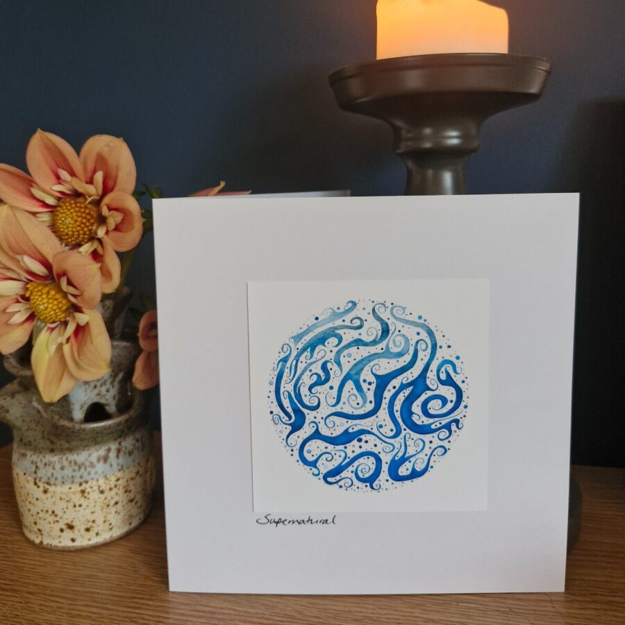 A beautiful handmade card with a print of an original artwork "Supernatural" by Hannah MacIver. The card is left blank inside for your own message.