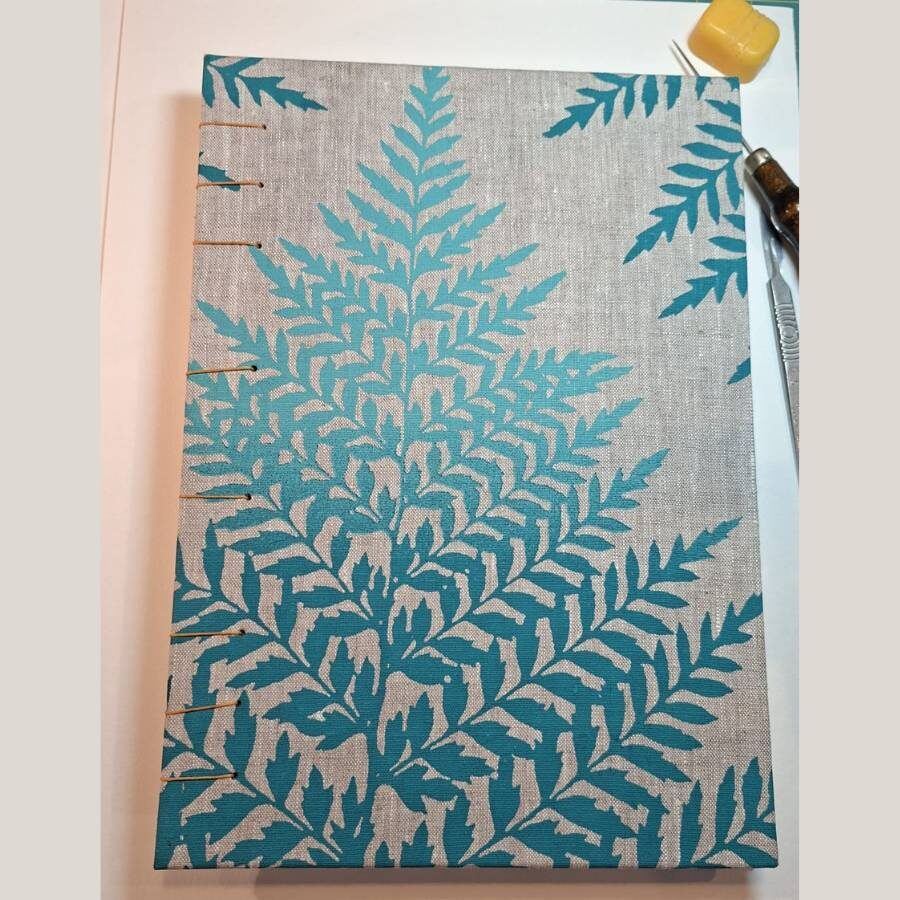 A hard cover sketchbook covered in leaf design bookcloth and containing 30/60 A4 pages of Shore & Marsh 350 gsm watercolour texture/plain paper. Bound with waxed polyester twine for strength in both Coptic and French Link stitch.